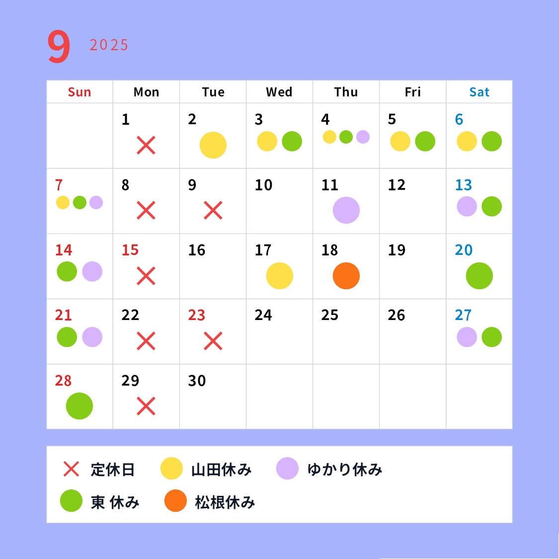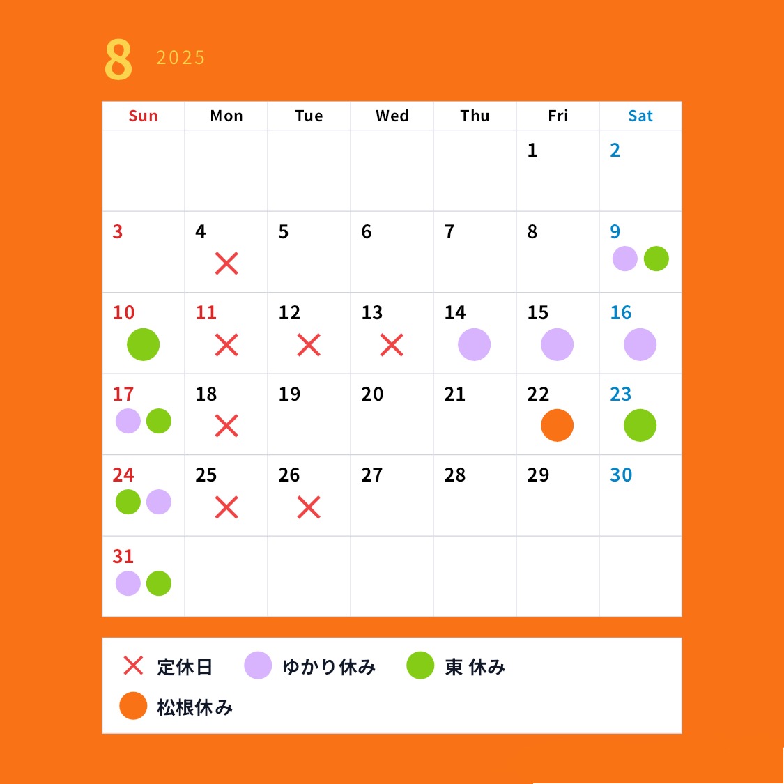 HOME > お知らせ > 8月9月の定休日のおしらせ 8月9月の定休日のおしらせ2025-8-8 こんにちは!真夏の暑いひがつづいてますね! 学生は夏休みが始まりウキウキしますね♪ 夏バテには気を付けてくださいね!! さて、お店の定休日が決まりました! 8月はお店の夏季休暇をいただきますので、ご予約の際はご注意ください! 8月11日~8月13日まで夏季休暇いただいております。 皆様とお会いできるのを楽しみにしております。